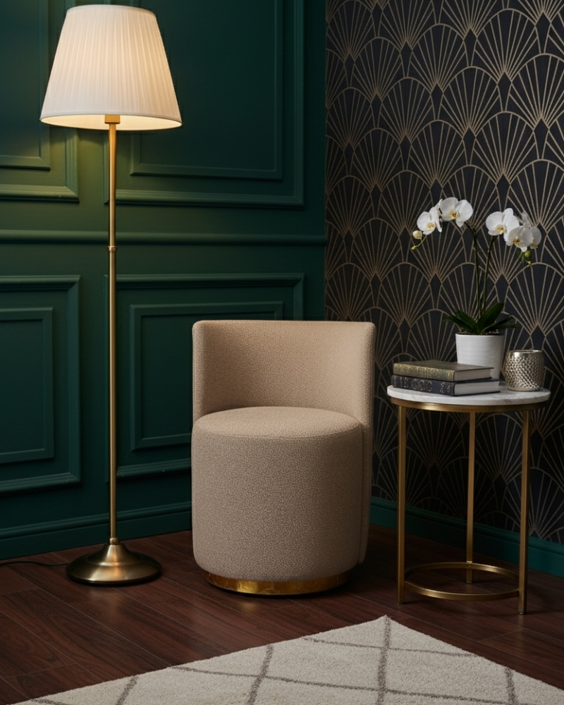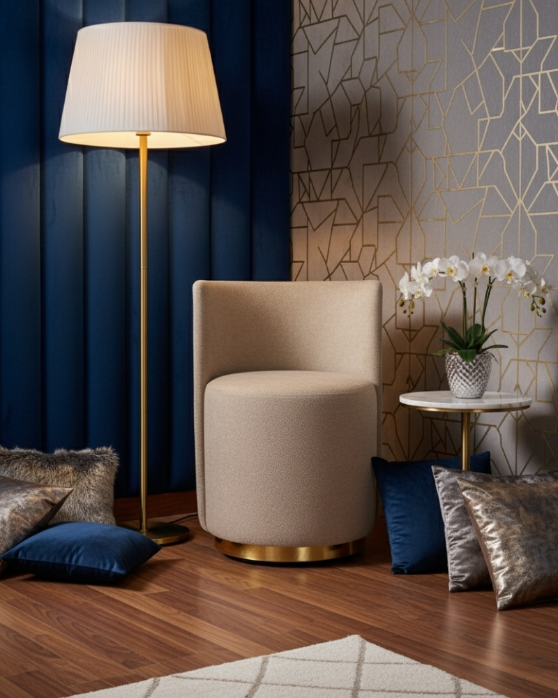 Valoure presents Aurelius, an exquisite statement chair where dramatic form meets tactile luxury, designed to command attention in any refined space. This piece showcases a captivating contrast: the deeply curved seat is enveloped in rich, opulent velvet, juxtaposed with the structured, outer backing tailored in a bespoke, high-end tweed fabric. The bold, cylindrical base is elegantly finished with a brushed metallic plinth, lending a radiant, architectural foundation to the design. Aurelius offers an enveloping, plush seating experience, delivering the perfect fusion of artistic design and unparalleled, enduring comfort. This is a timeless centerpiece that speaks to a heritage of sophisticated, modern living.