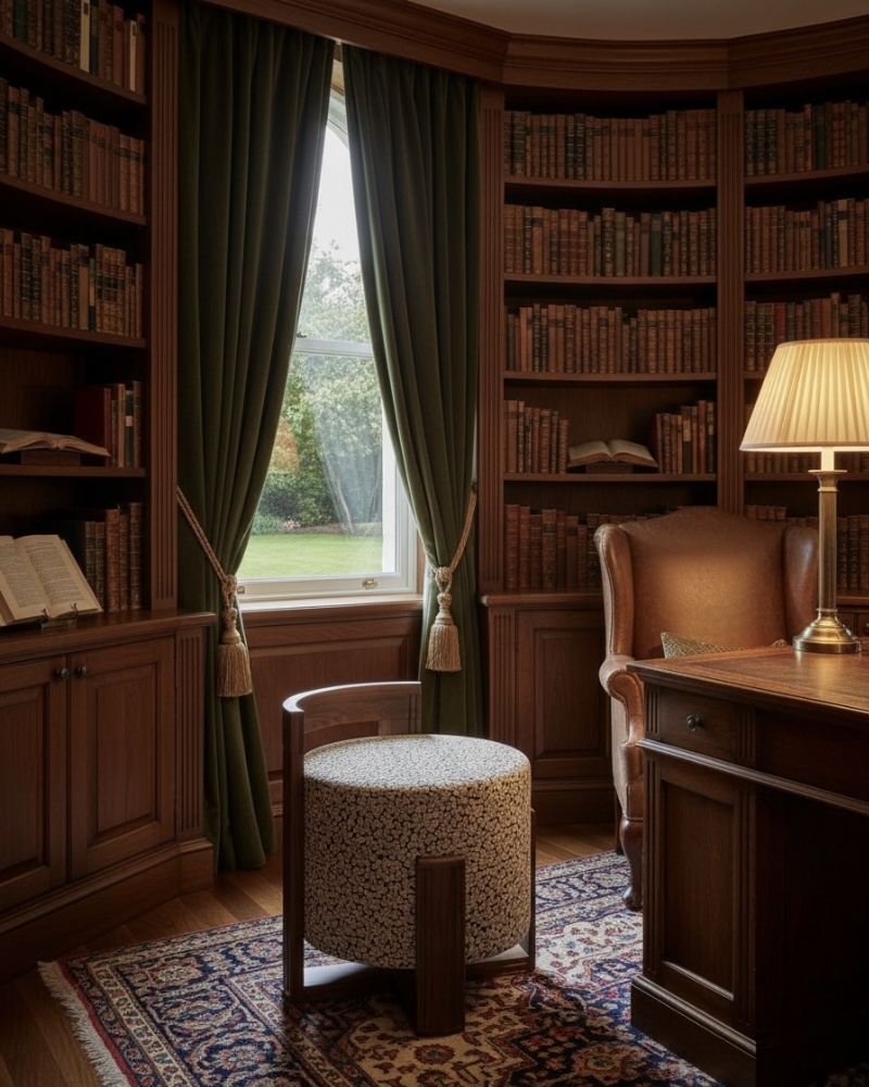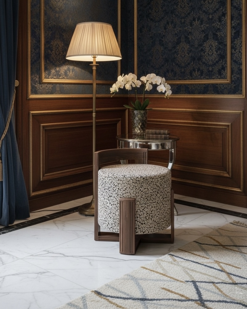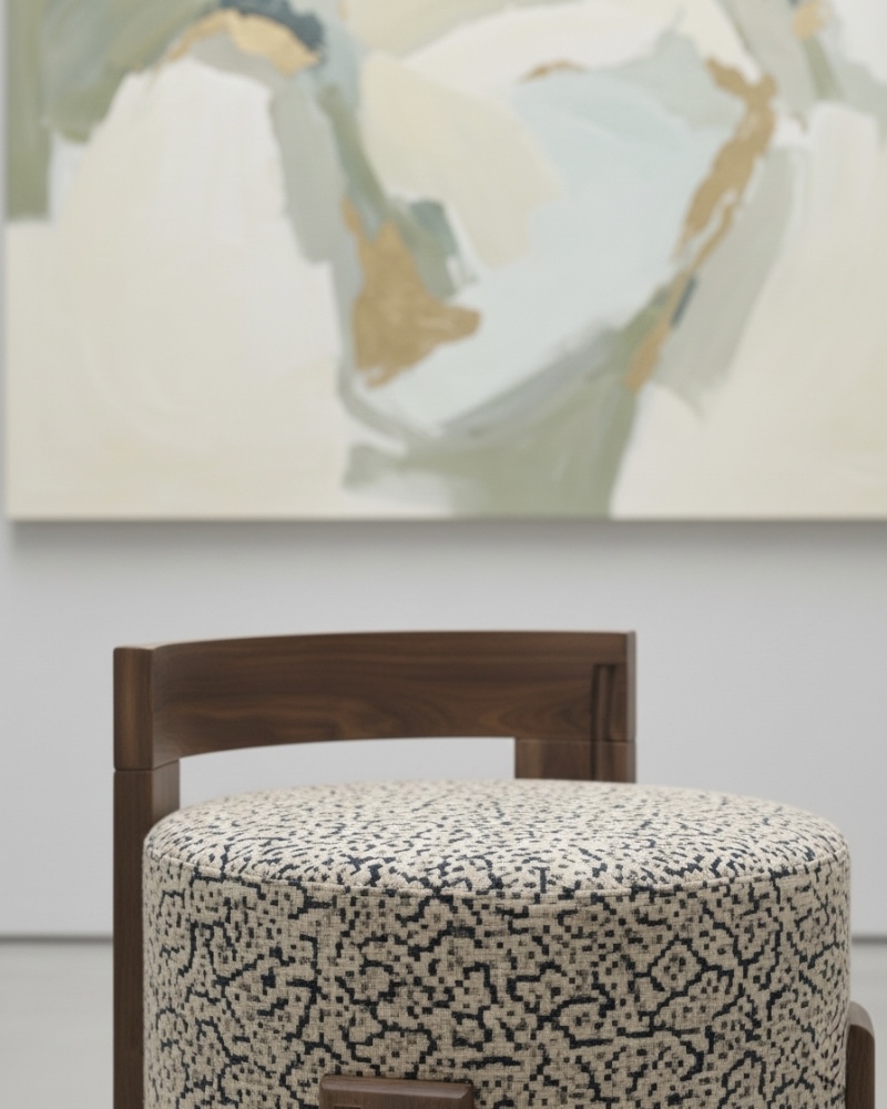 Valoure introduces Fuzzletush, an architectural accent piece that celebrates the elegant harmony between plush comfort and distinguished natural materials. The chair features a luxuriously deep, cylindrical cushion upholstered in a bespoke, highly textural patterned fabric, serving as a captivating focal point. This inviting softness is flawlessly contained within a substantial, expertly crafted hardwood frame, showcasing a rich grain and bold, geometric detailing. The upright wooden back provides subtle support while framing the plush seat for a dramatic, gallery-worthy presentation. Fuzzletush is a true statement of artful design, merging heritage craftsmanship with modern texture for a unique and exclusive seating experience.