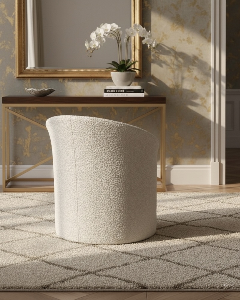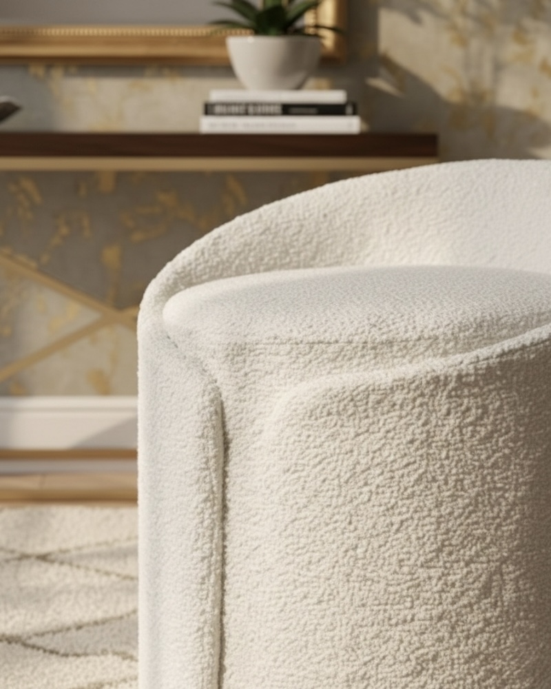 Valoure proudly presents Sitzzy, a statement chair defined by its inviting texture and soft, minimalist silhouette, offering the ultimate cloud-like seating experience. The entire piece is sumptuously enveloped in a premium, deep-pile shearling or bouclé fabric, delivering immediate tactile warmth and visual luxury. Its deep, circular seat and gently curved backrest create a cocooning, seamless form designed for intimate comfort and modern elegance. A subtle vertical seam detail adds a refined, tailored quality, preventing any visual break in its plush structure. Sitzzy is more than just a chair; it is an irresistibly soft, sculptural accent that elevates the feeling of comfort to an art form in any high-end living space.
